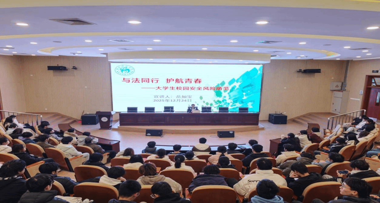 为增强学生法治观念与安全防范意识,筑牢校园安全防护网,12月24日,物理与材料工程学院在学术报告厅举办“与法同行 护航青春——大学生校园安全防范”主题普法宣讲活动。本次活动由学院特邀具有丰富法律知识与实务经验的辅导员岳加宝老师担任主讲,滨湖校区各年级各班学生代表参加。