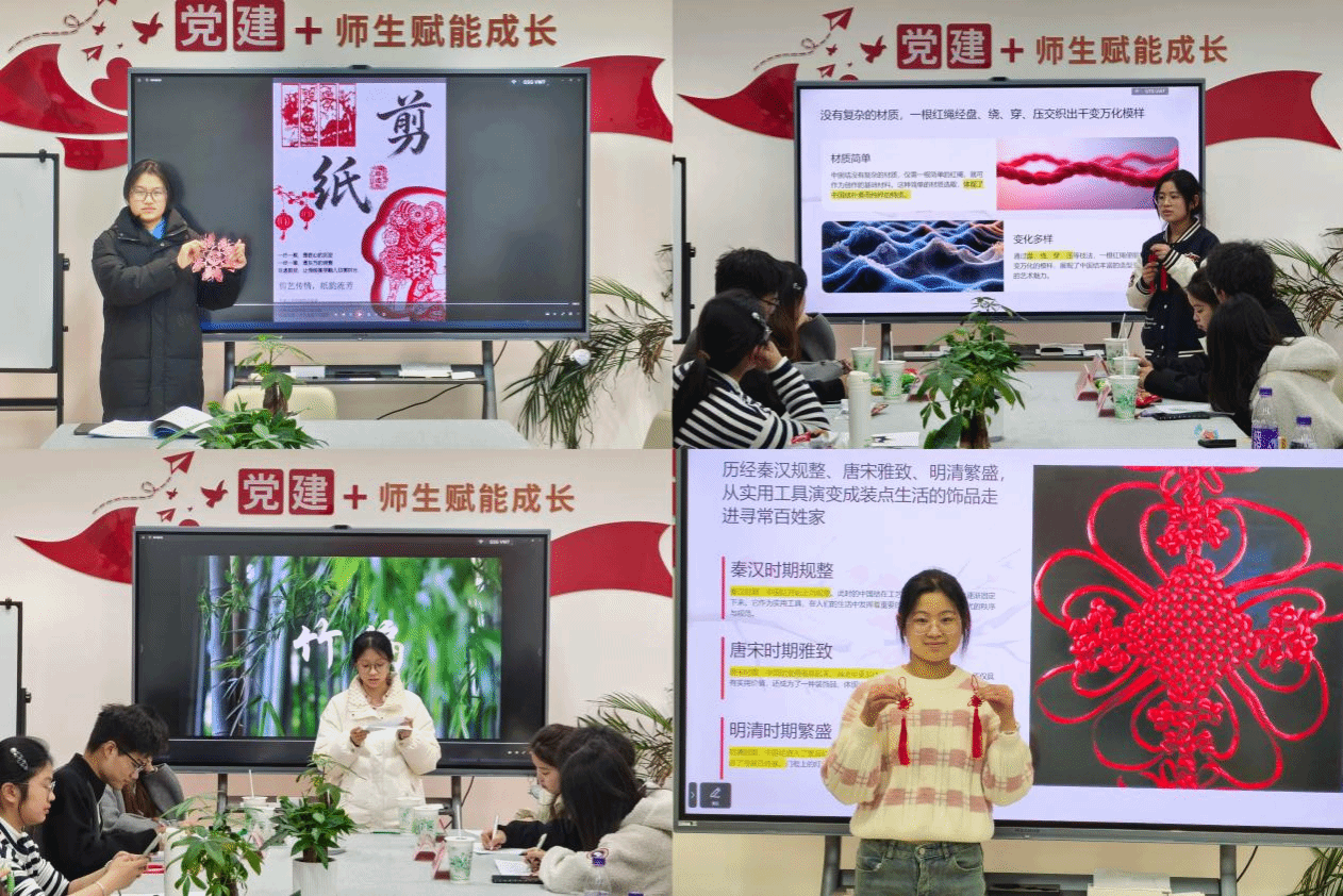 活动现场,方佳妮的分享围绕折纸剪纸展开,她结合自身实践,讲述折纸剪纸的创作巧思、纹样寓意,以及从民间手艺到艺术创作的发展历程;肖子祥以气血三针为核心展开讲述,他用通俗易懂的语言拆解专业知识,让同学深入了解这一传统医技的独特价值;范忠敏则将视线聚焦于中国结,从一根红绳的编织技法,到结饰背后承载的吉祥寓意与文化象征,在讲述中展现出跨越时空的生命力。