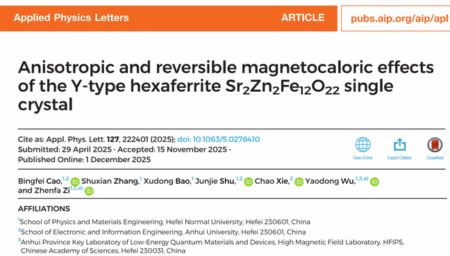 近日,由物理与材料工程学院訾振发教授带领的磁性功能与器件研究团队在Y型六角铁氧体的磁热效应和磁制冷领域取得重要进展,相关成果以“Anisotropic and reversible magnetocaloric effects of the Y-type hexaferrite Sr2Zn2Fe12O22 single crystal”为题发表在物理学知名学术期刊《Applied Physics Letters》。《Applied Physics Letters》创刊于1962年,由American Institute of Physics出版,方向涵盖应用物理全领域,在行业细分领域中学术影响力较大,专业度认可很高,对原创文章要求创新性较高。物理与材料工程学院与安徽大学联合培养的硕士研究生曹冰菲同学为本论文的第一作者,訾振发教授与吴耀东高级实验师为本论文的共同通讯作者,物理与材料工程学院为本论文的第一单位和唯一通讯单位,多名本科生参与了本论文的研究工作。